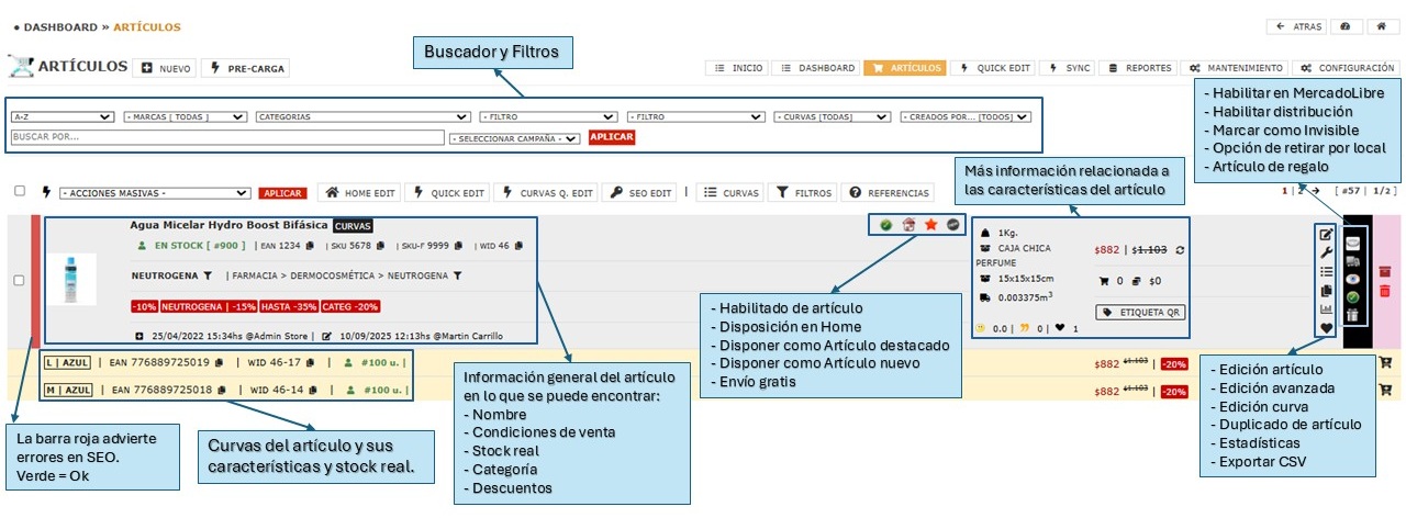 El módulo Artículos es el núcleo operativo para gestionar los productos cargados en la tienda. Desde aquí se visualizan, editan, crean o eliminan artículos individuales, se organizan por categorías y marcas, y se vinculan atributos clave que afectan tanto al backend como a la experiencia del cliente.