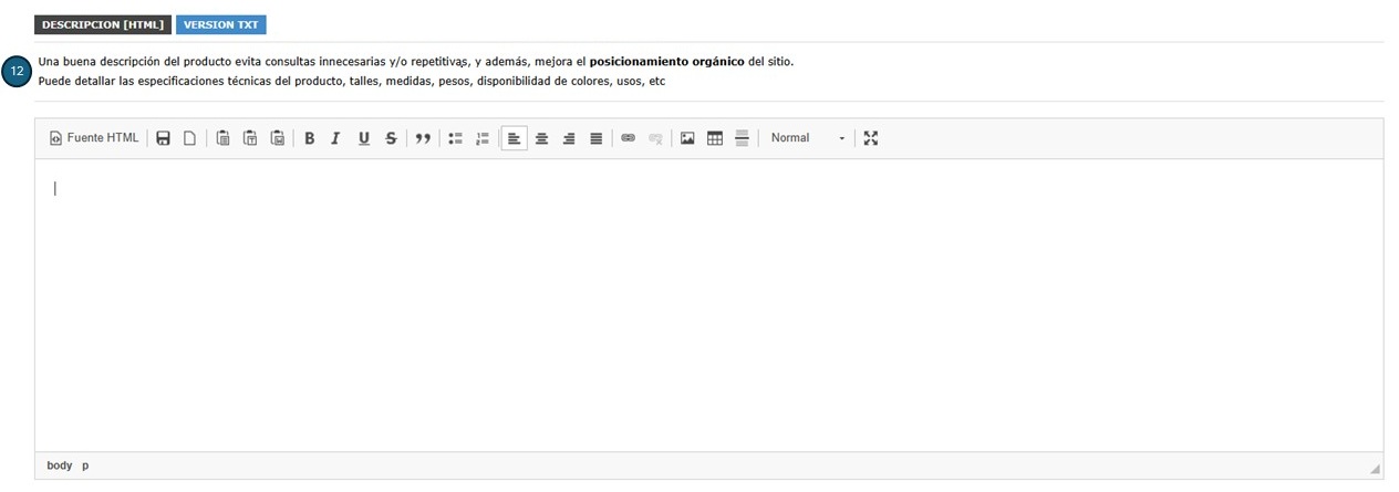 12. Descripción del artículo: Se presenta un cuadro editor de texto basado en HTML diseñado para la creación de descripciones del artículo. Incluye herramientas básicas como negrita, cursiva, subrayado, tachado, cita textual, listados enumerados o con viñetas, alineación de texto, hipervínculos, inserción de imágenes, cuadros, líneas horizontales y opciones de formato de texto en estilo normal, H1, H2 y H3.