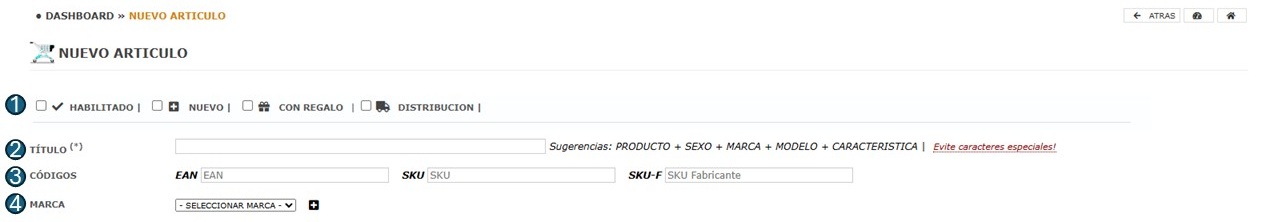 La opción NUEVO permite acceder a la configuración completa para crear un nuevo artículo.