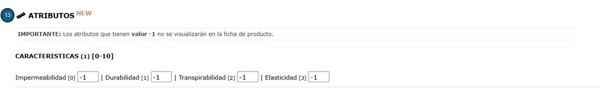 - ATRIBUTOS: Dirigirse a Artículos > Artículos > Atributos. Esta función permite asignar atributos al artículo (como impermeabilidad, abrigo, resistencia, etc.) en una escala predefinida. Dispones de 10 grupos con distintas opciones dentro de cada uno.