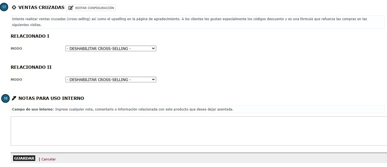17. VENTA CRUZADA: Posibilidad de relacionar con dos cross-selling diferentes, ya sea opción de productos, artículos, marca o basado en estadísticas.
