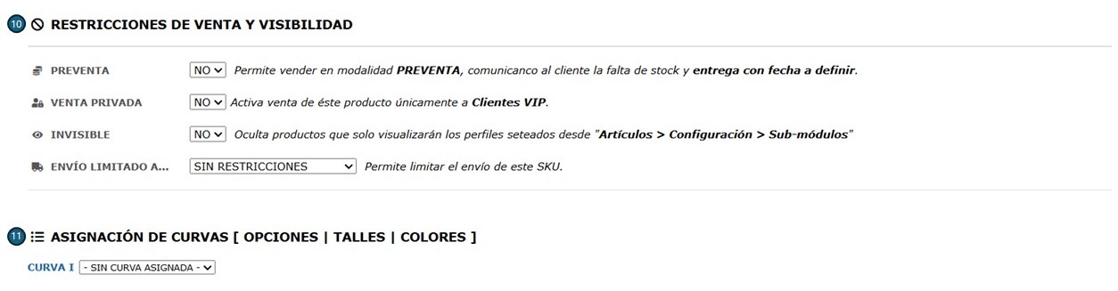 11. ASIGNACIÓN DE CURVAS: Selecciona una o más curvas de talles/colores precargada. Utiliza la Guía de gestión de curvas de talles, colores, etc.