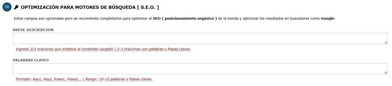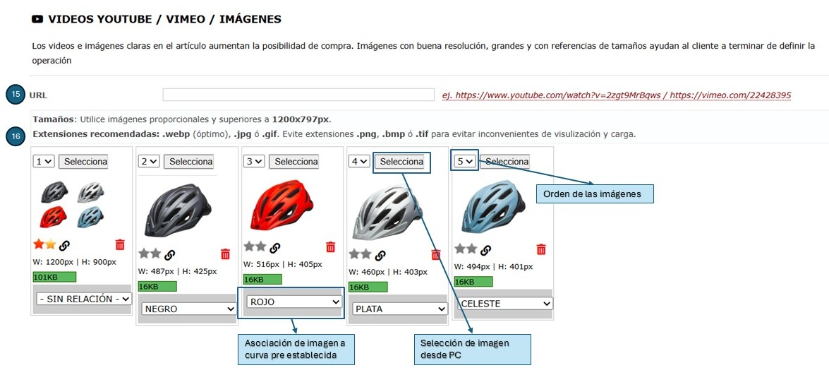 Desde aquí se podrá cargar imágenes y un video representativo del producto. Tener en cuenta los limites de peso, tamaño y tipos de archivo.
