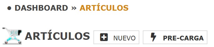 Para la creación de nuevos artículos, debe dirigirse a Artículos > Artículos. Existen tres métodos disponibles: la carga individual mediante la opción NUEVO, que permite configurar todos los parámetros; la PRE-CARGA, que facilita la carga masiva con configuración básica; y, adicionalmente, la carga masiva por SINCRONIZACIÓN de un archivo tipo CSV, guía que se explica en el siguiente link en guías avanzadas