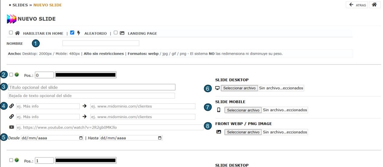 - Posicionar en home: Habilita este grupo de slides en el home de la tienda online.