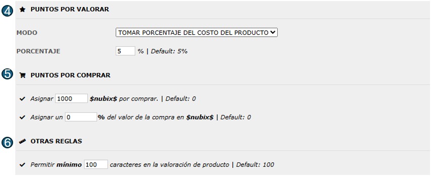 Aquí se define cómo se otorgan puntos cuando el CLIENTE realiza una compra y/o valora los productos adquiridos: