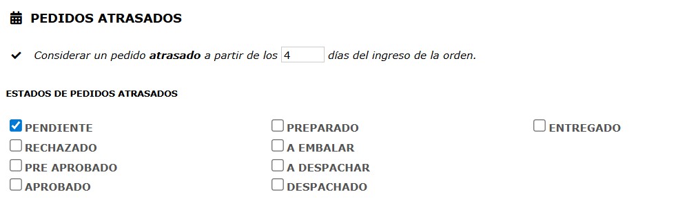 - Establecer la cantidad de días transcurridos desde la creación del pedido para marcarlo como atrasado.