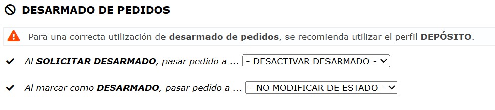 Para una correcta utilización del desarmado de pedidos, se recomienda operar con el perfil DEPÓSITO, ya que está directamente vinculado al armado de pedidos y al control del stock real de los artículos.