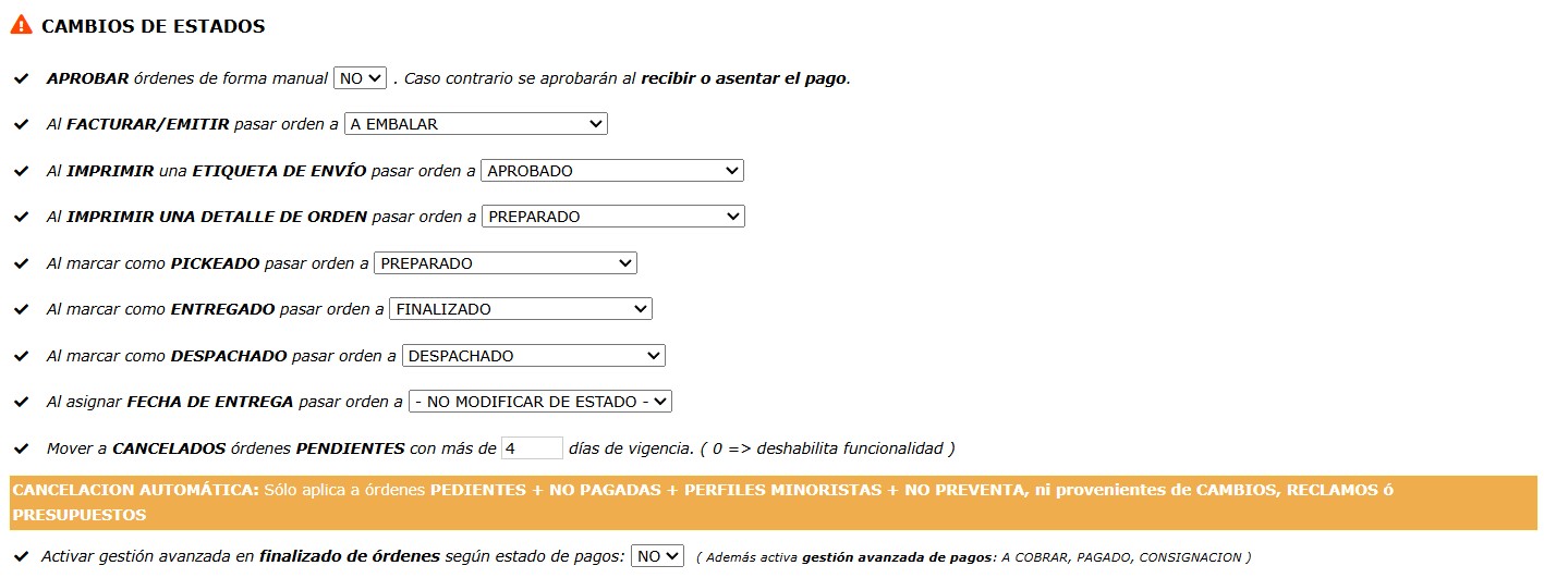 Esta sección permite automatizar los cambios de estado del pedido según distintas acciones que se producen dentro del sistema. No todas las acciones admiten la totalidad de los estados disponibles y, en cada caso, también es posible optar por no automatizar el cambio y gestionarlo de forma manual.