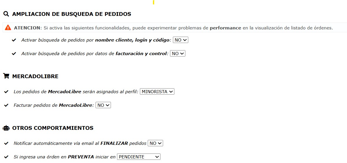 IMPORTANTE: La activación de estas opciones puede impactar negativamente en el rendimiento y velocidad de carga del listado de pedidos, especialmente en tiendas con alto volumen de órdenes.