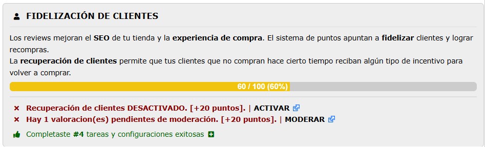 Este indicador también informa si algún aspecto del módulo se encuentra deshabilitado, permitiendo detectar configuraciones incompletas sin necesidad de ingresar al módulo. Al hacer clic en MODERAR, el sistema redirige directamente al listado de valoraciones pendientes.