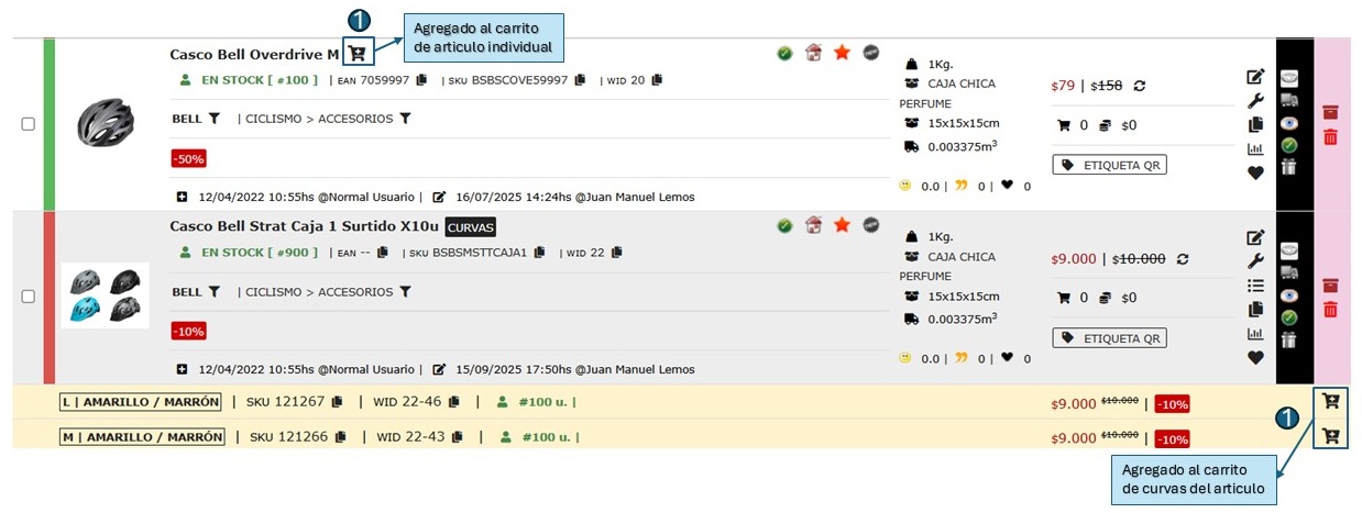 Desde el catálogo, añadir los artículos para el combo al carrito con la cantidad de unidades correspondiente de cada uno. Podes agregar productos al carrito desde el frontend de la tienda, o bien desde el backend, como se muestra en la siguiente imagen.