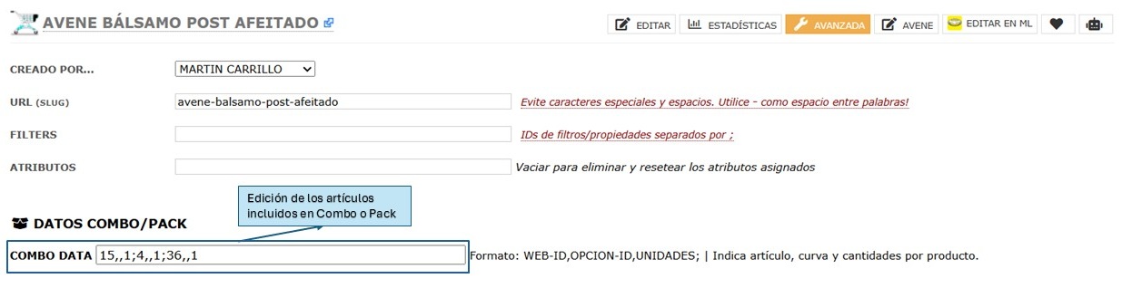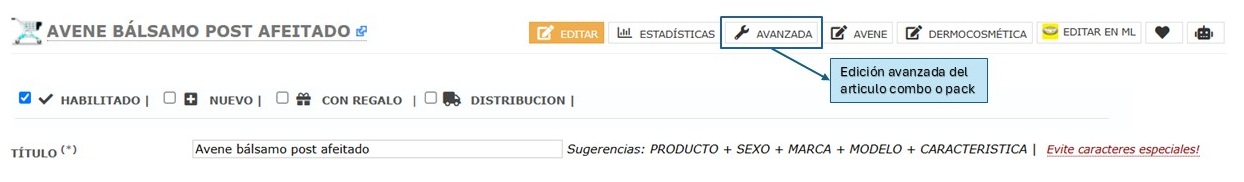 4. Edición avanzada de COMBO / PACK: En la edición avanzada es posible modificar los artículos que forman parte del combo o pack. Para ello, se debe acceder a las opciones avanzadas del combo seleccionado.