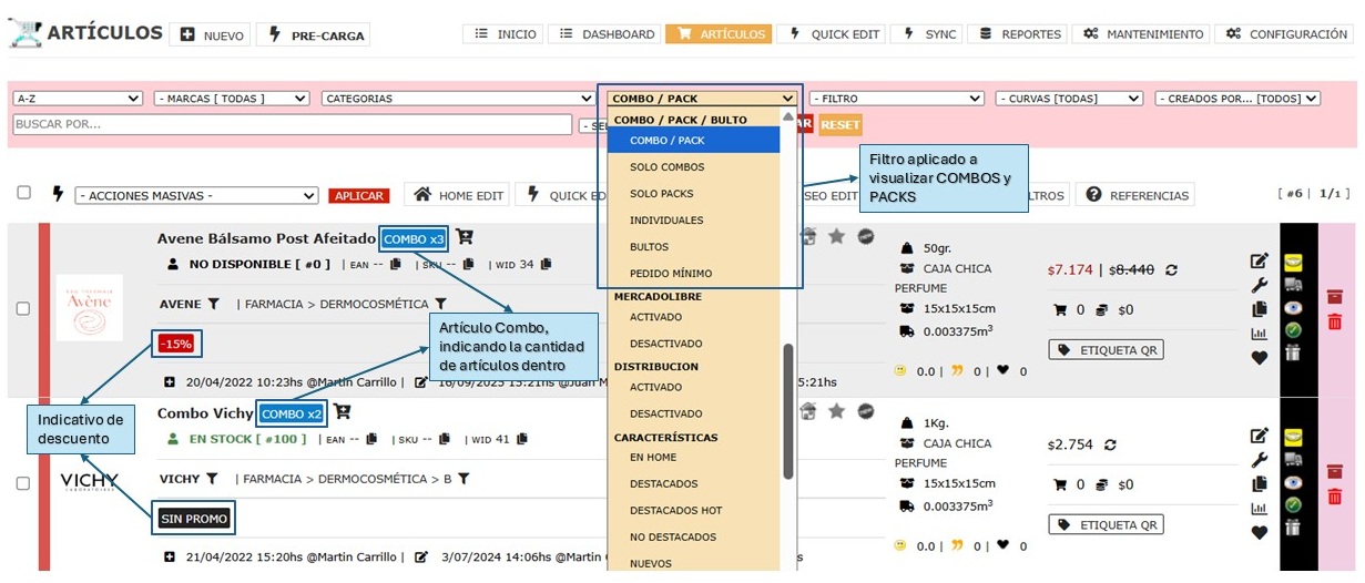 En la sección Artículos, se muestran todos los artículos individuales, combos y packs activos.